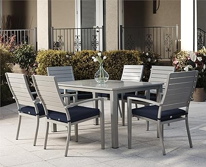 Hanover Montclair 7 Piece Steel Outdoor Dining Set With Navy Blue Cushions Swivel Rockers And Dining Table
